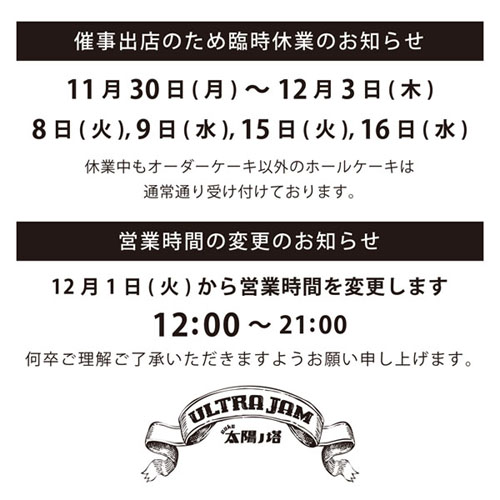 またウルトラジャム以外のcafe太陽ノ塔全店(HOME店・GREEN WEST店・GARDEN店・UMEDA店・別館)・kobito de punchでのお受渡し・お召上がりのご予約も承らせて頂きます。